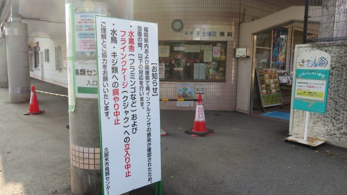 HOMEニュース鳥インフルエンザ対策の実施について 鳥インフルエンザ対策の実施について 鳥類センター 福岡県内において鳥インフルエンザが確認されたことに伴い、 11/18(火)より以下の事項を中止いたします。 ・フライングケージ(クジャク類、ホロホロチョウなどを飼育)への立入り及び餌やり ・水きん舎(フラミンゴ、ペリカンなどを飼育)への立入り及び餌やり なお、10/21から中止させていただいている ・傷病野生鳥獣の受け入れ についても中止を継続しております。 お客様には大変ご不便をおかけし申し訳ございませんが、ご理解、ご協力いただきますようお願いいたします。