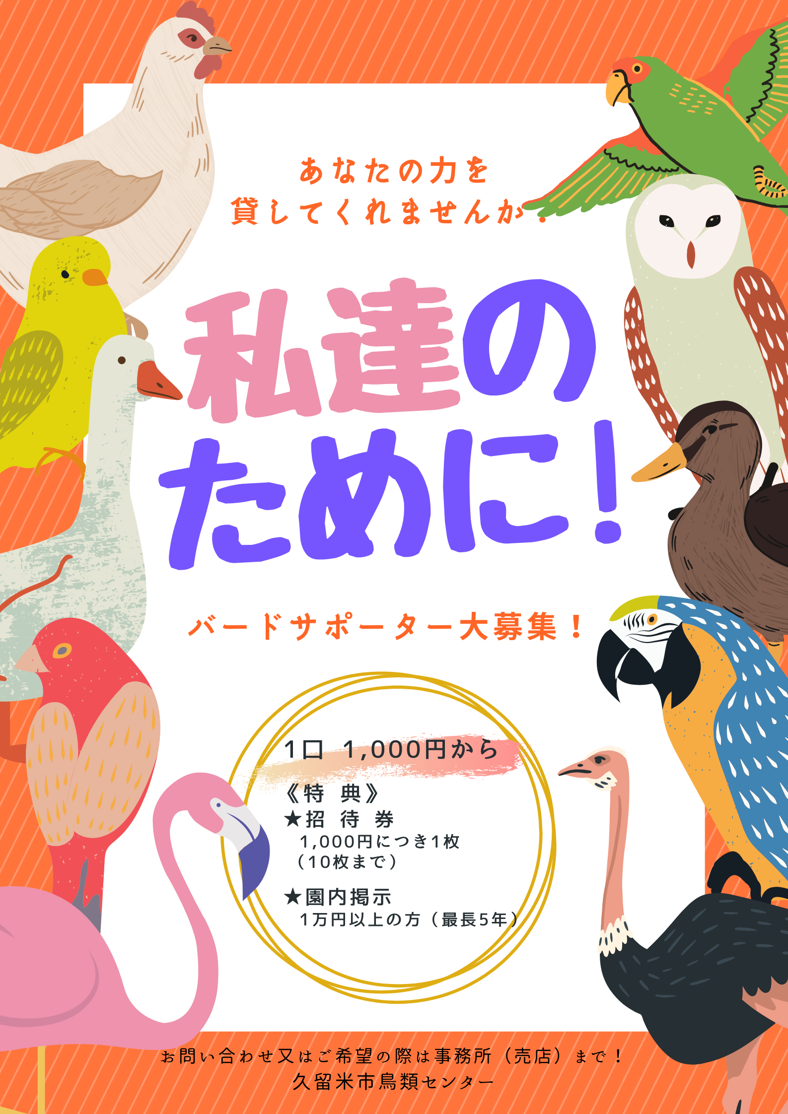 久留米市鳥類センターでは、当園を応援してくださるバードサポーターを募集しています。